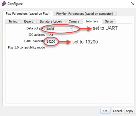 Restore default parameters (under File menu). As you become familiar with PixyMon software you will find yourself tuning colors for your environment’s lighting and background, sometimes moving your robot from place to place – especially to demonstrate to others. It can be fastest to restore the default parameters and reteach the color signatures in your new environment. When do this, you’ll also have to configure the Data out port and UART baudrate settings again, as shown above. These settings are necessary for our example code.