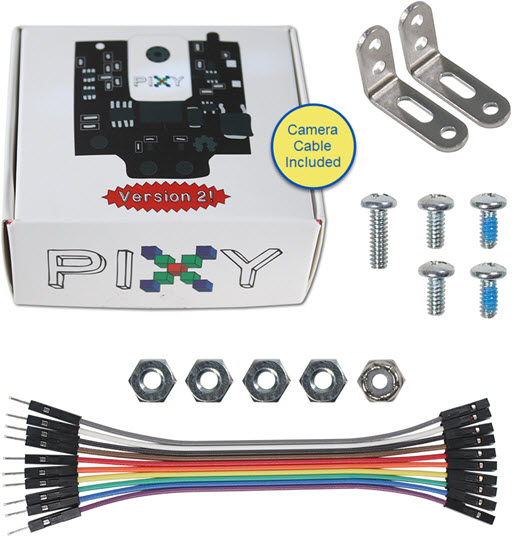 The Pixy2 CMUcam w/ Cable + Mounting Hardware kit comes with the following parts. Make sure you have everything: