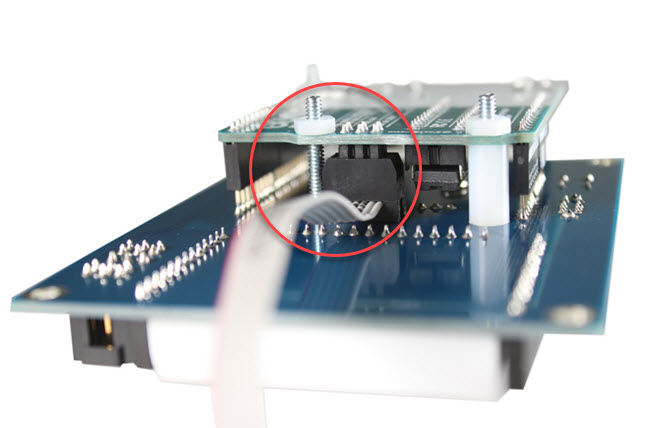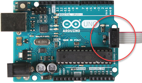 - Connect the Pixy2 camera’s ribbon cable to the Arduino Uno, with the wires leading away from the board, as pictured.