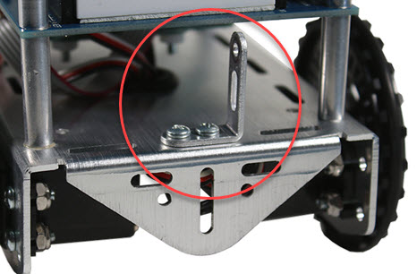 - Connect an ’L’ bracket into the front of the Shield-Bot chassis, using two 1/4″ screws and two nuts, as shown. Note that it is slightly off center. This will allow the Pixy2 camera to be centered, after accounting for the thickness of the ’L’ brackets.