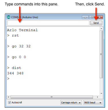 You can also communicate with the Arlo through the Terminal. The example shown here uses rst to reset the Arlo’s encoder counts to 0. It’s the equivalent of Arlo.clearCounts(). Next, go 32 32 sets the motor power of both motors to 32/127. It’s the equivalent of Arlo.writeMotorPower(32, 32). After some time went by, go 0 0 was typed in to stop the wheels, then dist, which got a reply of 344, 348. Those are encoder measurements of the number of 144ths of a revolution each wheel turned. These values can also be obtained in a sketch with longVariable = Arlo.readCountsLeft() and longVariable = Arlo.readCountsRight().