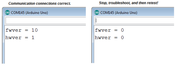 This next sketch asks the DHB-10 for its hardware and firmware versions, and displays the results in Terminal. Here is what you’ll see if your Arduino communicates successfully with the DHB-10 (left) alongside messages you might see if communication fails (right).