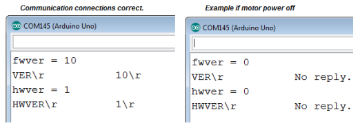 If the Arlo replies with 0 values for fwver and hwver, this sketch will display the entire transaction between Arduino and DHB-10. The lines with the \r shows the actual serial communication from Arduino to DHB-10 (VER\r) and from the DHB-10 to the Arlo (10\r if communication, or messages like No reply in the case where the motor power is not on).