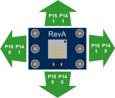The 4-Directional Tilt Sensor uses two I/O pins; we have them connected to P14 and P15 in our example. The diagram below shows what each I/O pin will detect when the sensor is tilted in each direction.