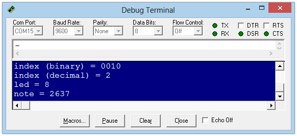 DEBUG "index (binary) = ", BIN4 index, CR DEBUG "index (decimal) = ", DEC index, CR DEBUG "led = ", DEC led, CR DEBUG "note = ", DEC note, CR