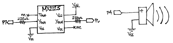 The image below shows the schematic for the Boe-Bot with the accelerometer circuit. The servo and piezo speaker connections are from Robotics with the Boe-Bot (#28125). The connections for the accelerometer are featured in Chapter 3 of Smart Sensors and Applications.