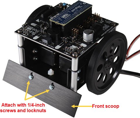 - Using two 1/4-inch screws and two locknuts, attach the scoop to the outside of the scoop mount. The screws go on the outside of the scoop, and the nuts go underneath.