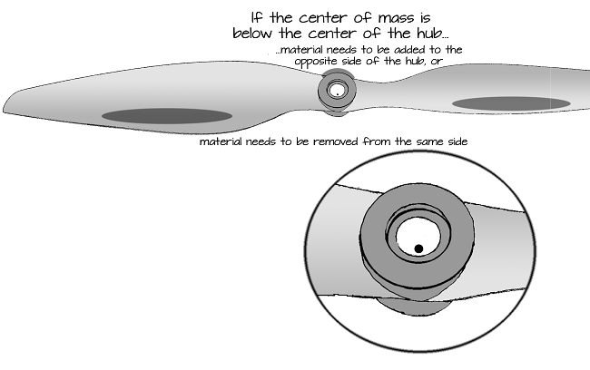 The propeller’s center of mass should be in the very center of the propeller’s hub. You can imagine it as a small dot. When you place the propeller in the propeller balancing tool, how it turns and settles helps you determine if the center of mass is not centered on the propeller, and if it is only slightly or very off-center.