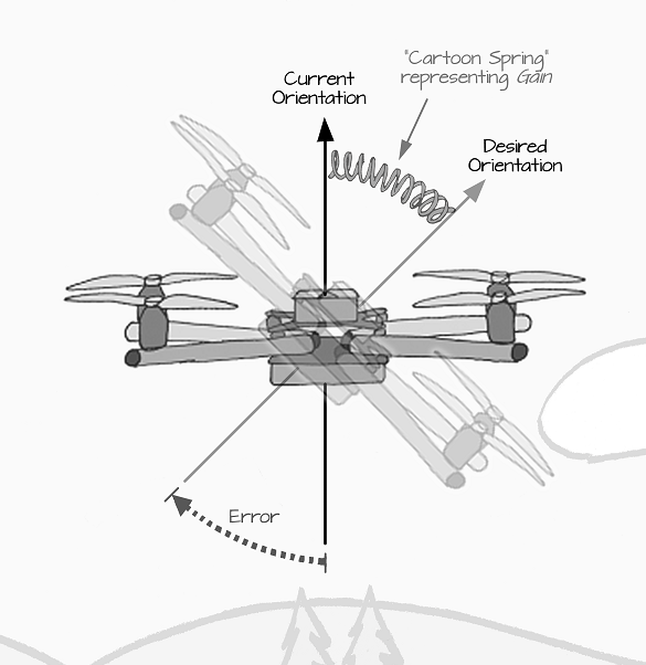To understand how control gain works, let’s use an analogy. First, it is helpful to understand there are two “orientations” that the ELEV-8 v3 is continually updating within the Flight Controller: its current orientation and the operator’s desired orientation. For instance, if the ELEV-8 v3 is hovering, and the operator pushes the right stick to the right, the new desired orientation is a clockwise roll to the right: