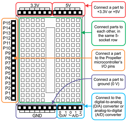 The cyber:bot’s breadboard is surrounded on three sides by black sockets. These make it convenient to connect circuits on the breadboard to power, ground, and the Propeller I/O pins. There are also sockets to connect to a digital-to-analog converter signal from the Propeller chip, and to an analog-to-digital converter on the micro:bit.
