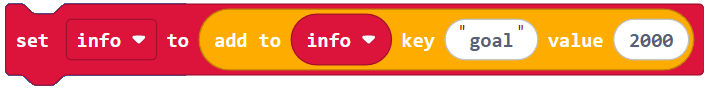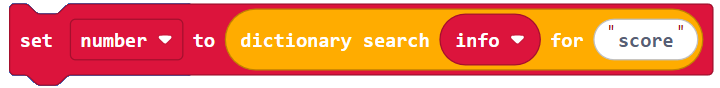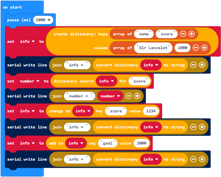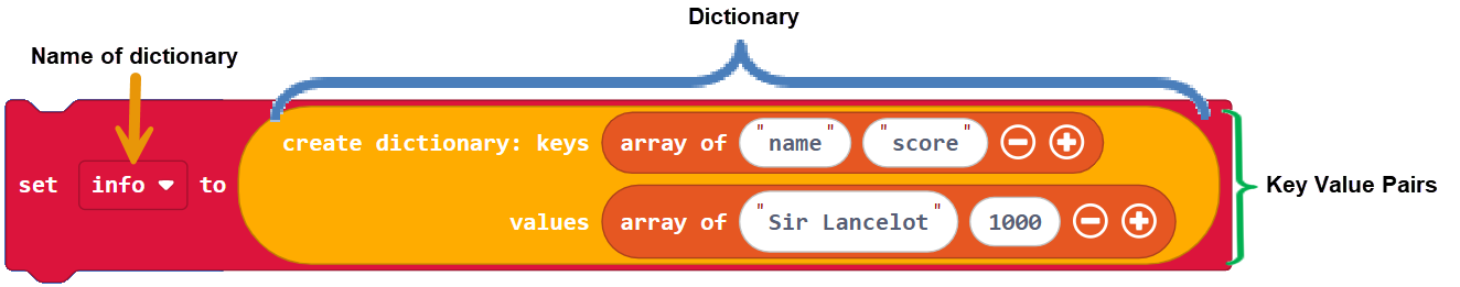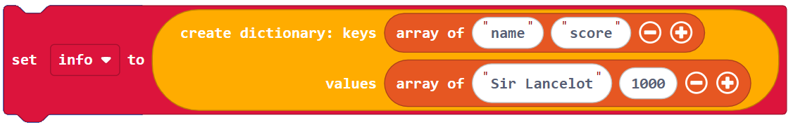In Makecode, a dictionary is a collection of key-value pairs. For example {‘name’: ‘Sir Lancelot’, ‘score’ : 1000} is a dictionary that contains two key-value pairs ‘name’: ‘Sir Lancelot’ and ‘score’ : 1000. Sir Lancelot is the string value that’s paired with the ‘name’ key, and 1000 is the int value paired with the ‘score’ key.