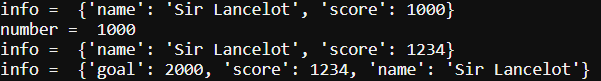 - The initial dictionary print is info = {‘score’: 1000, ‘name’: ‘Sir Lancelot’}