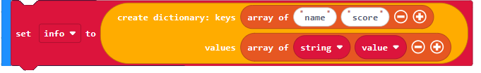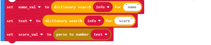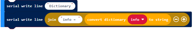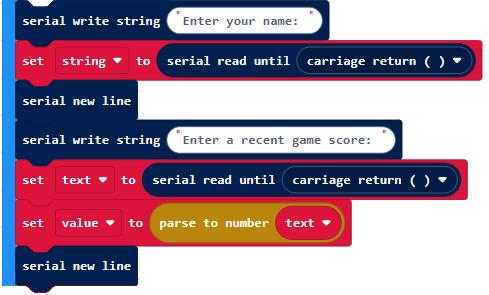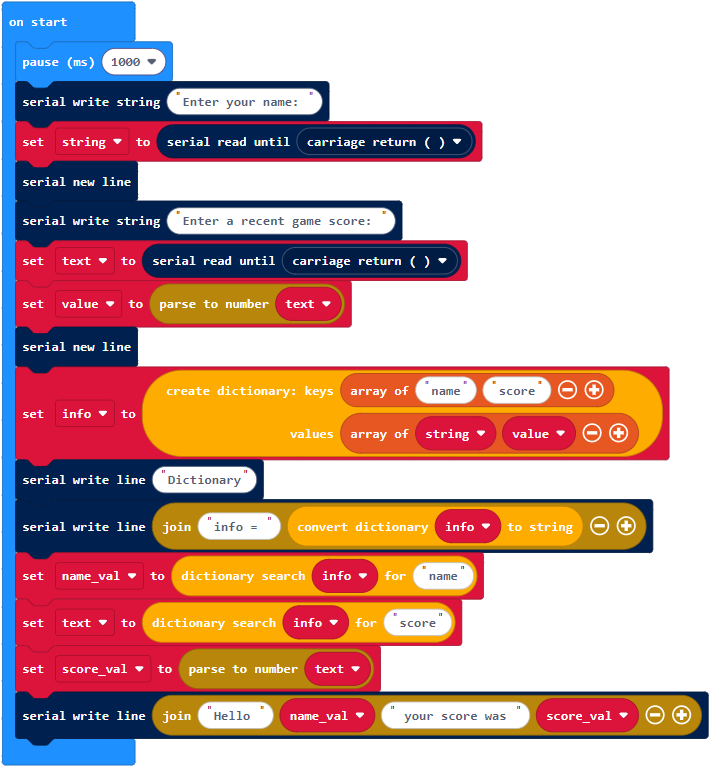 The first serial write block is just a heading. The second one displays name: and score: then the contents of the dictionary. Continuing the Sir Lancelot example, it would look like this: name: Sir Lancelot score: 1000