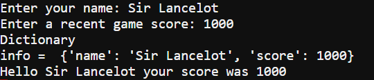 Assuming you entered Sir Lancelot for the name and 1000 for the score, the terminal should respond with info = {‘name’: ‘Sir Lancelot’, ‘score’ : 1000} on one line and Hello Sir Lancelot your score was 1000 on the next.