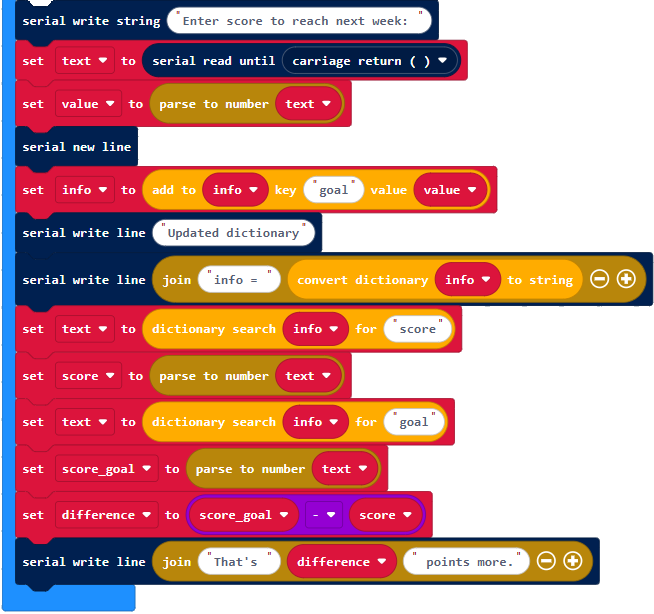 Look what happened to the key-value pairs. The Makecode runtime interpreter changed the order when you added the goal’: 2000 pair. Again, that change in order did not matter because the project used the ‘score’ and ‘goal’ keys to look up the values that are stored in the score and score_goal variables. Then, the project used these values to correctly calculate: