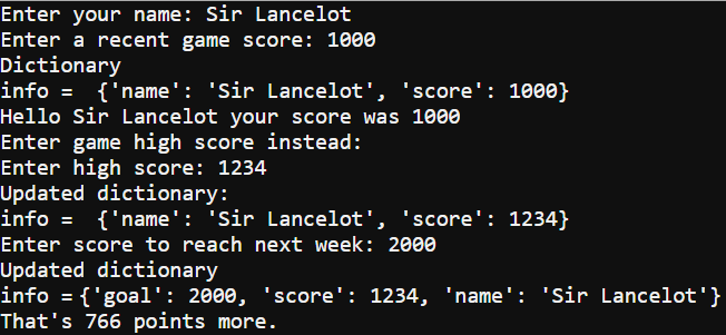 - Verify that the updated dictionary that gets displayed is info = {‘goal’: 2000, ‘score’: 1234, ‘name’: ‘Sir Lancelot’}.