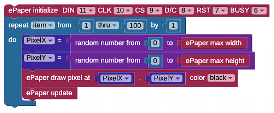 The random number blocks provide a random value between 0 and the maximum screen dimension, given by the ePaper max height and ePaper max width blocks. These numbers are then used to set the position of the pixel drawn by the ePaper draw pixel block. This then repeats and updates the screen 100 times, drawing 100 different pixels on the ePaper screen. The updating of the screen slows down the process just enough so that you can see the pixels appear.
