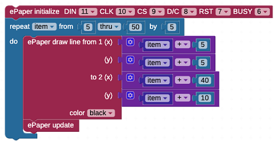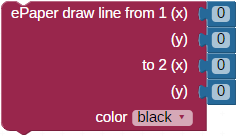 To draw a line, you need to define a start and an end point – the ePaper draw line block takes two x/y coordinates:
