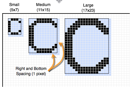The width of each character increases by 6 pixels from small (6 pixels wide) to medium (12 pixels wide) to large (18 pixels wide). The height increases by 8 pixels from small (8 pixels tall) to medium (16 pixels tall) to large (24 pixels tall). Because there is a 1 pixel spacer on the right and top of each character, the actual character size is 1 pixel less: