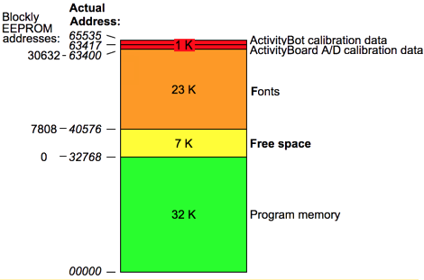 If you look carefully at the example chart above (though your program may not have ActivityBot calibration data in the EEPROM), when fonts are installed, there are about 7.8 kilobytes available for other uses. In BlocklyProp, that area is accessible via the Memory > EEPROM blocks.