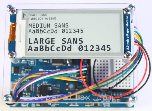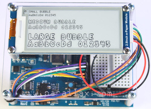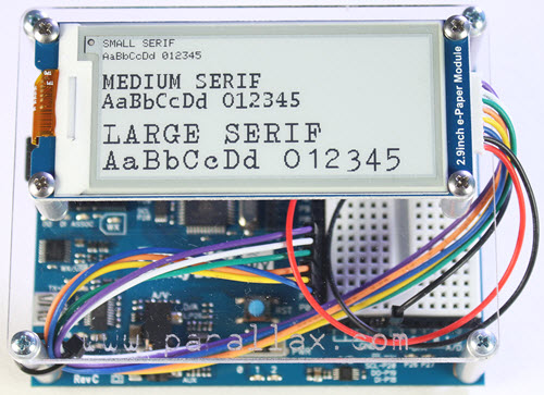 Four Fonts, Three Sizes — The default Sans font style does not need the ePaper font loader block. But once you have loaded the ePaper font loader block project to EEPROM, you have the fancy Serif, Script, and Bubble fonts to use. Here are the sizes available to each font: