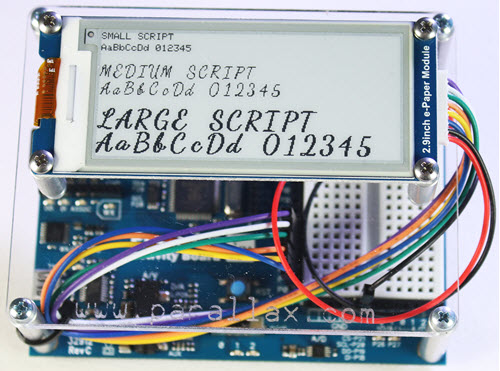 When the ePaper initialize block is used, it sets up the Propeller microcontroller to communicate with the ePaper module. The ePaper initialize block installs 1 small font, which allows you to print text and numbers to the ePaper module’s screen. You may want to use a medium or large sized font instead. In order to use different fonts, you will have to install them into the EEPROM memory on your Activity Board.