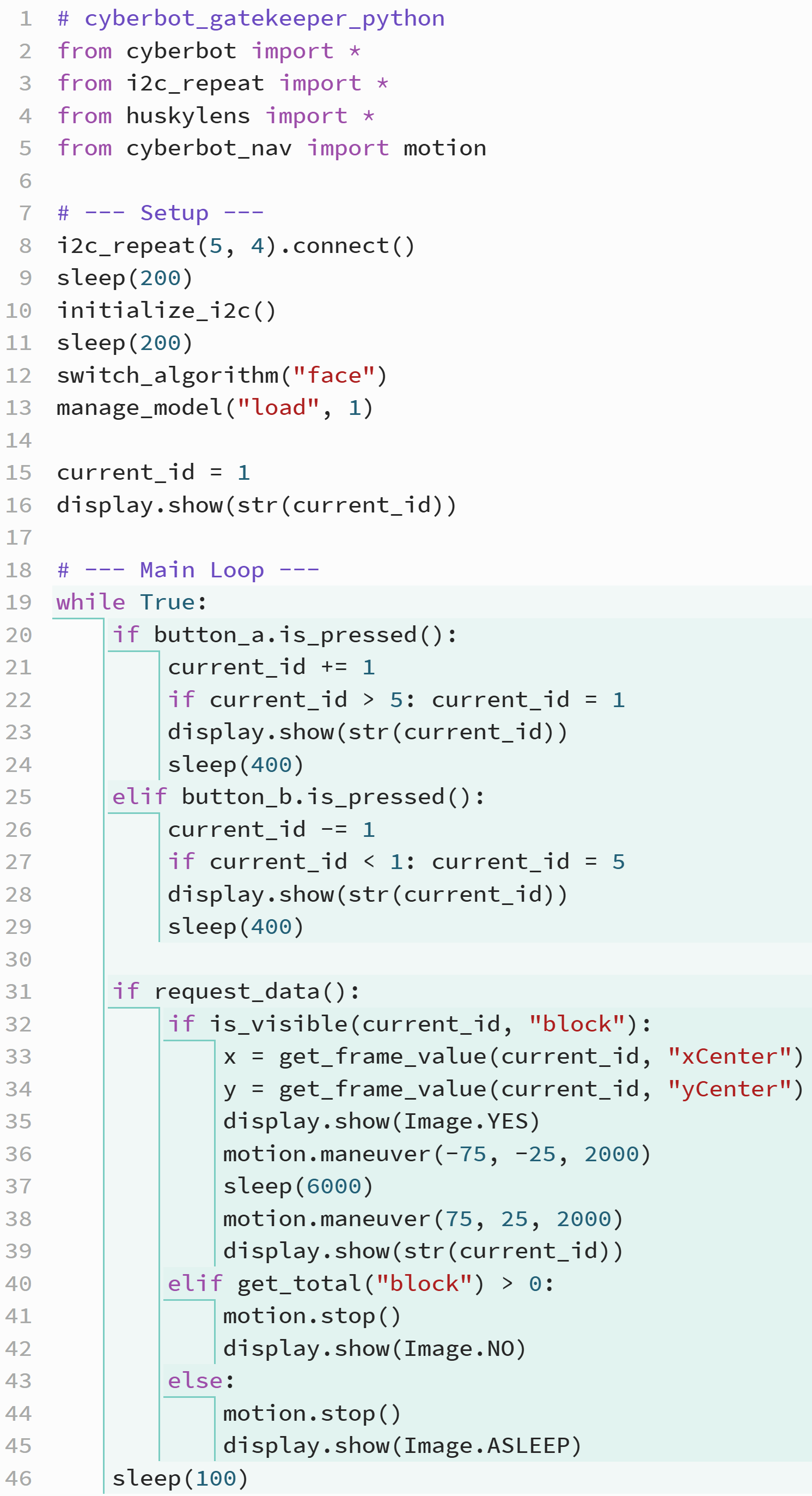 This script makes the cyber:bot react when it sees a recognized face ID from the HUSKYLENS. Each ID is stored in the camera’s internal model so the robot can distinguish between faces you’ve trained.