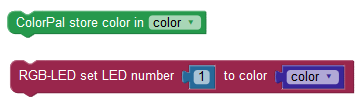 The ColorPal and WS2812 RGB LED blocks were both designed to combine all red, green and blue color values into a single 24-bit number. While the individual red, green and blue components may also be captured individually, it’s really easy to use these two blocks together with one variable named color.