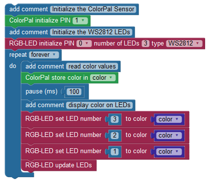 Simply sense the color with the ColorPal, save it in a variable, and output it on the WS2812 RGB LEDs.