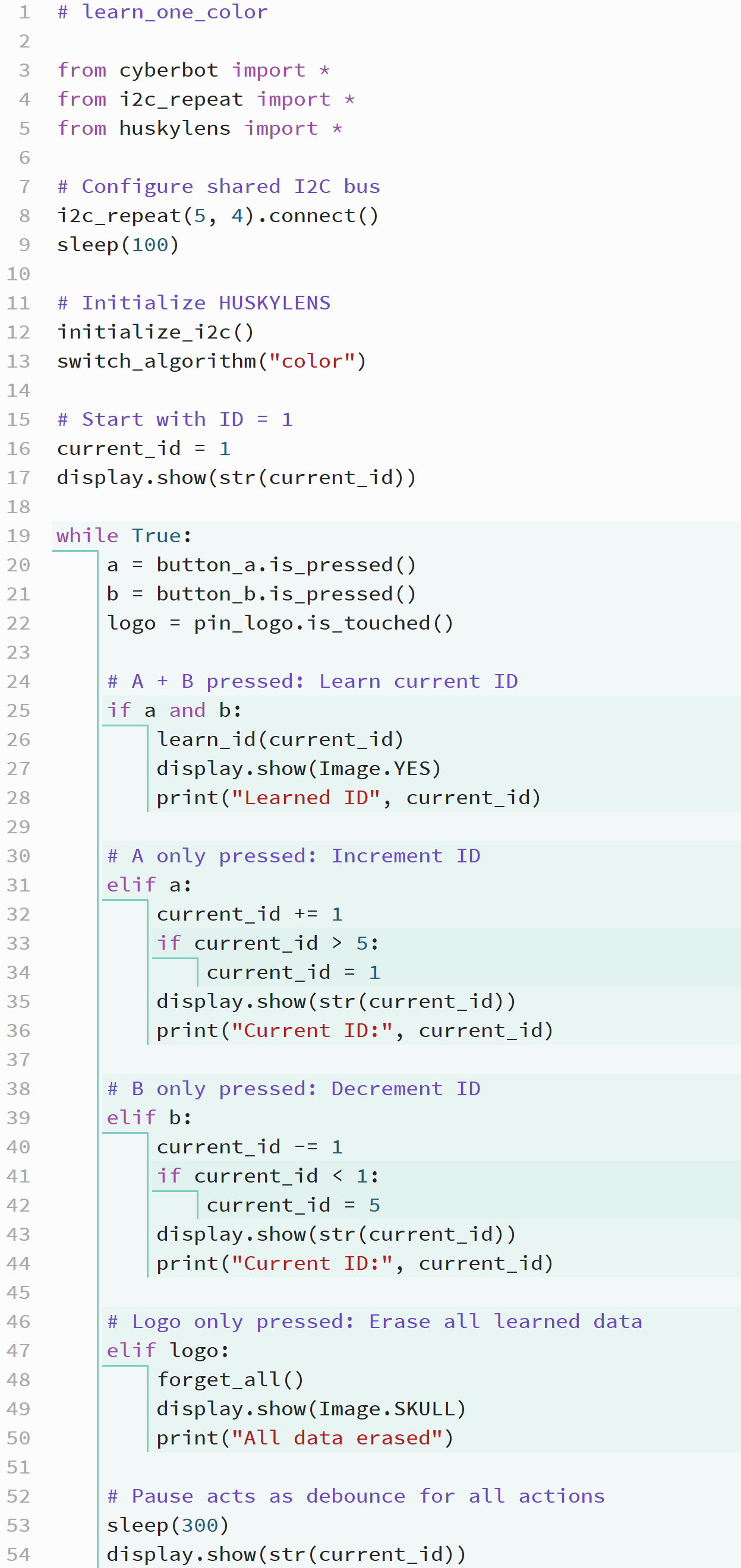 learn_id(current_id)instructs the HUSKYLENS to learn the color it currently sees. The display showsImage.YES, and the current ID is printed to confirm learning. - If only Button A is pressed, the program increments the ID by 1. When the number passes 5, it wraps back to 1. The updated ID is shown on the display.