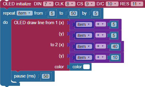 To draw a line, you need to define a start and an end point – the OLED draw line block takes two x/y coordinates: