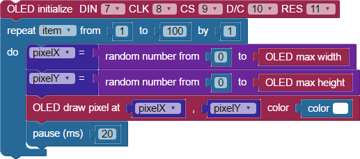 The random number blocks provide a random value between 0 and the maximum screen dimension, given by the OLED max height and OLED max width blocks. These numbers are then used to set the position of the pixel drawn by the OLED draw pixel block. This then repeats 100 times, drawing 100 different pixels on the Color OLED’s screen. The pause 20 block slows down the process just enough so you can see the pixels appear individually instead of all at once.