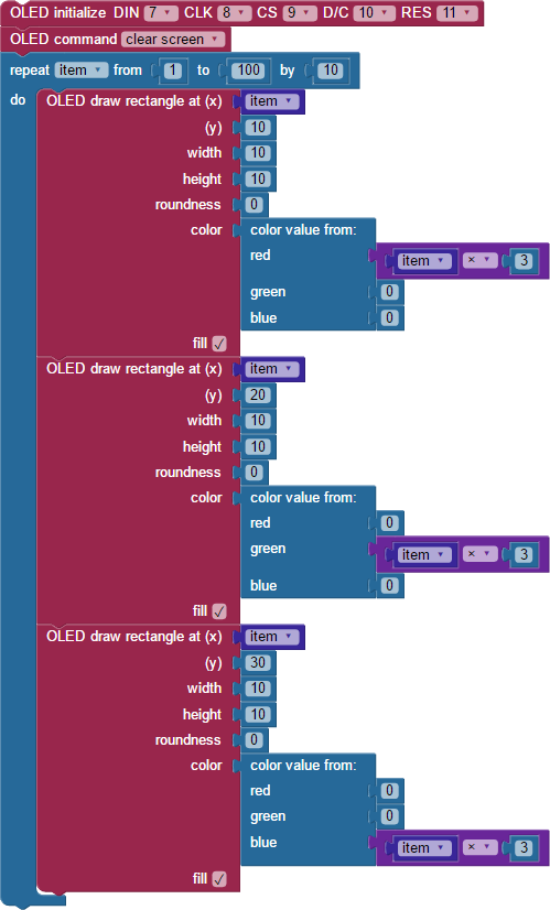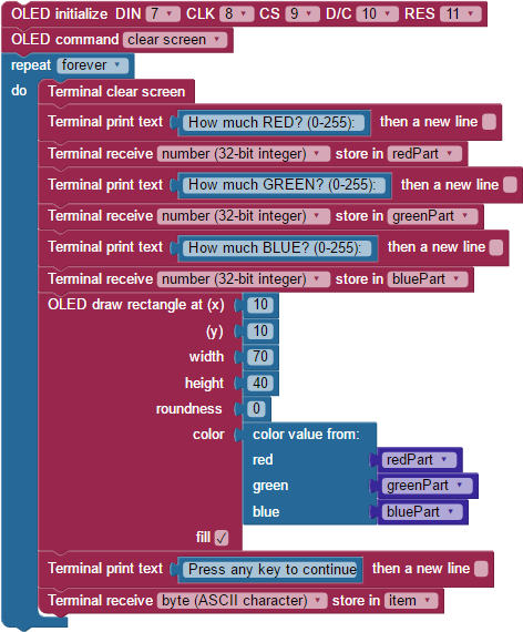 You will use some of these blocks to generate different colors for the shapes you will draw on your Color OLED’s screen.