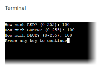 The Terminal window will appear and ask you to enter three values (one for red, one for green, and one for blue) between 0 and 255.