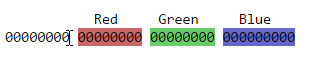 The nice thing about binary numbers is that we can use them to store a few pieces of information in a single number. In BlocklyProp, color is stored into 24 of the 32 bits. 8 of the bits represent how much red there is, 8 of the bits represent how much green there is, and 8 of the bits represent how much blue there is in a color: