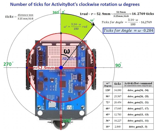 So if we want to program the ActivityBot to rotate ω degrees we can multiply by 0.284 in order to find the appropriate number of wheel ticks.
