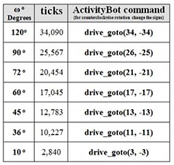 In the chart, the text under “ActivityBot command” reads: for counterclockwise rotation, change the signs. This means that to reverse the direction of motion, change positive values to negative, and negative values to positive. For example, drive_goto(34, -34) would become drive_goto(-34, 34), etc.