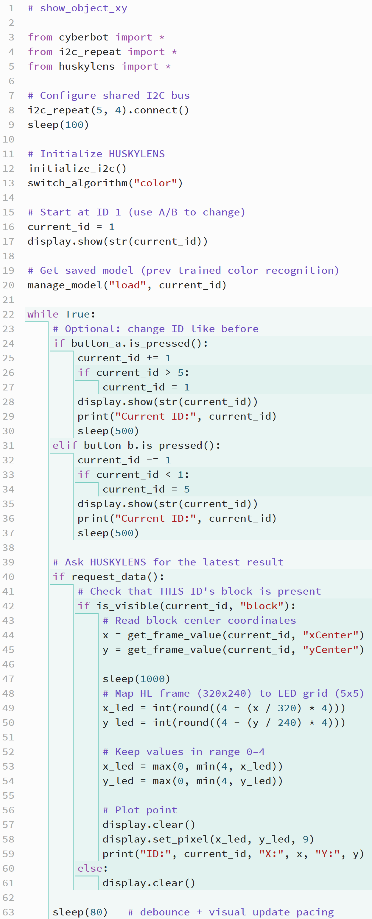 Now you’ll display what the camera “sees” on the micro:bit’s 5×5 LED grid. The micro:bit will plot a moving dot showing the (X, Y) position of your trained color in the HUSKYLENS field of view. This activity is the first step toward making your robot respond to what it sees.