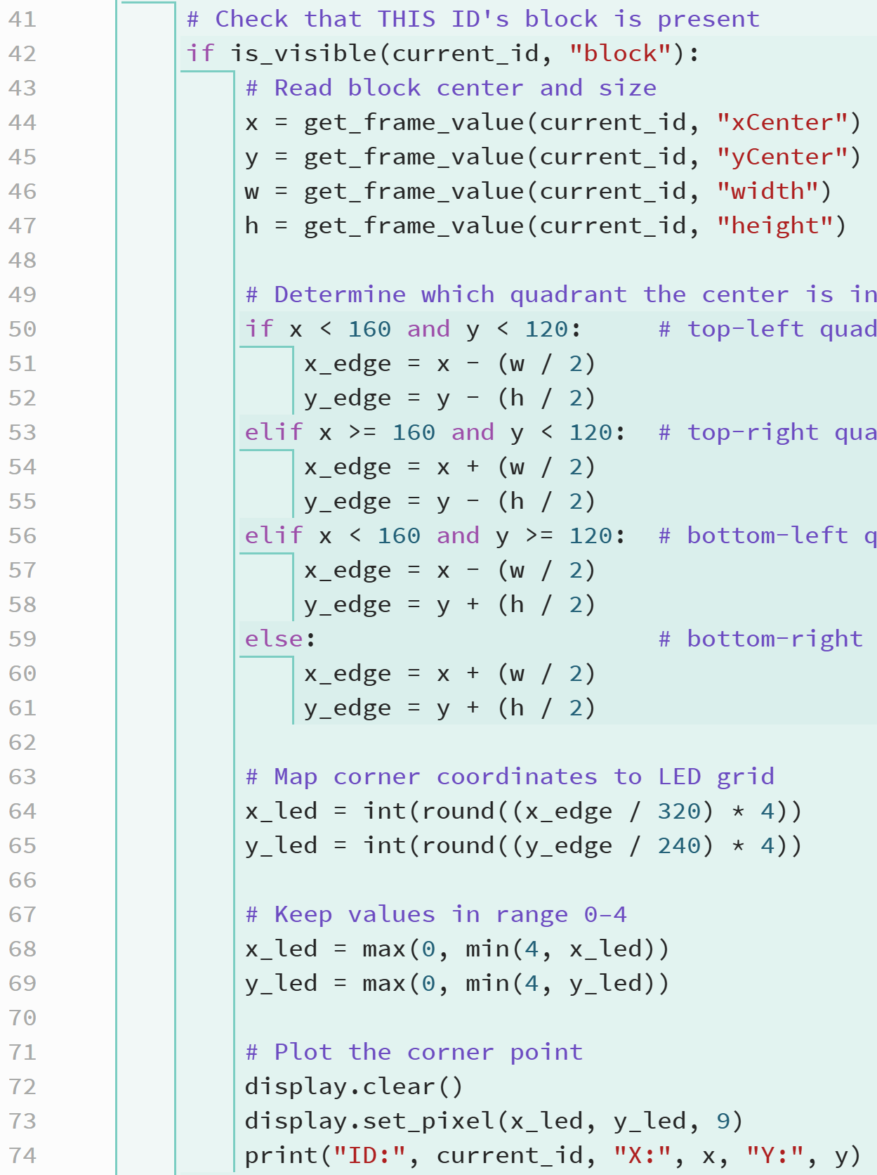 This ensures that as the object moves toward any edge of the camera’s view, the LED dot can reach the corresponding edge of the micro:bit’s 5×5 grid.