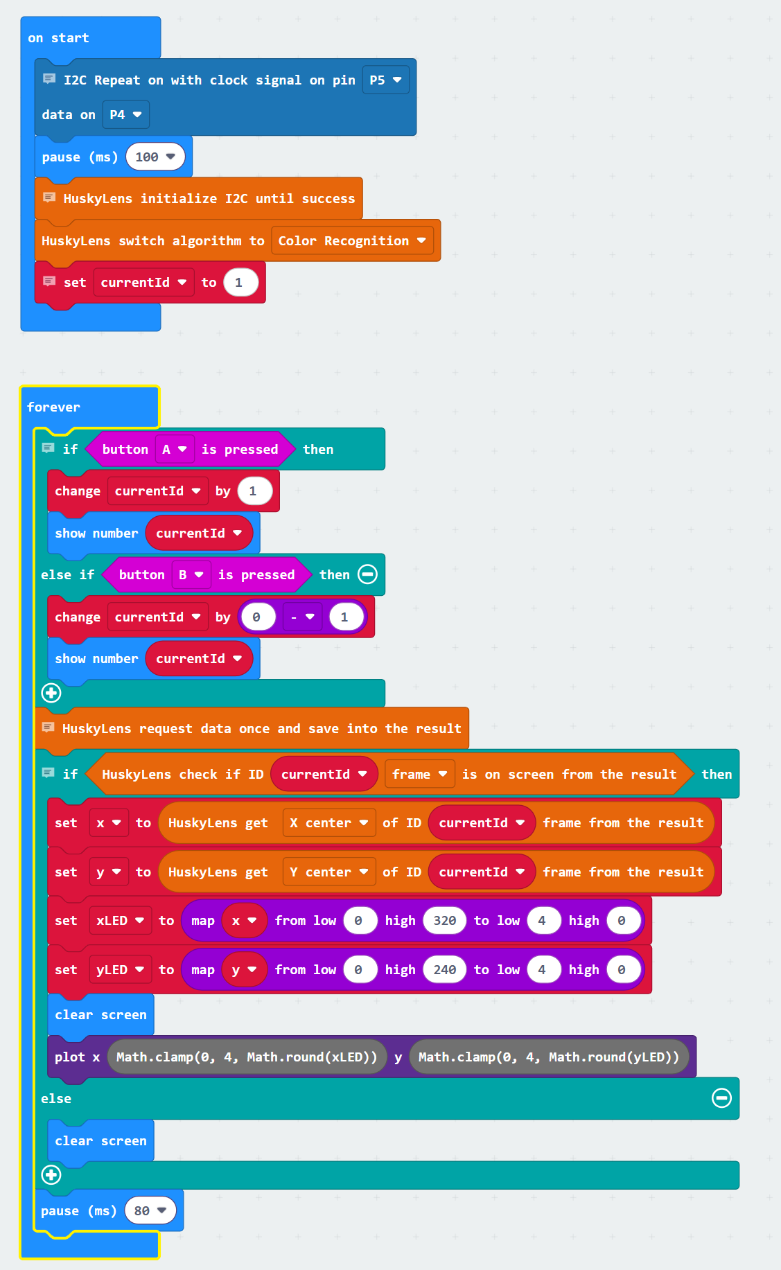 This script works like a simple feedback loop, but instead of moving the robot, it gives you a visual display of the object’s position. Each cycle, the HUSKYLENS reports the coordinates of the object’s center (x, y) on its 320×240 camera screen. The program scales those values down to fit the micro:bit’s 5×5 LED display.