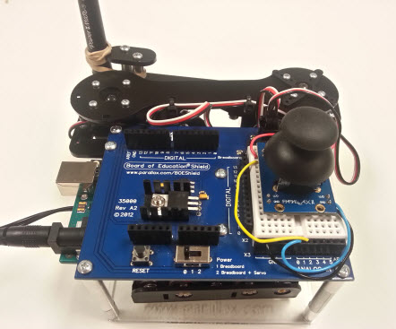 Once you complete the build and load the code, go ahead and power up the unit. Observe its response. Make sure you’re able to bring the arm all the way in, and all the way out by moving the joystick right then left. If you are unable to achieve full motion, adjust the position of the arm by removing the center screw holding each servo horn and placing it in different positions on the servo spline until you achieve the maximum range of motion.