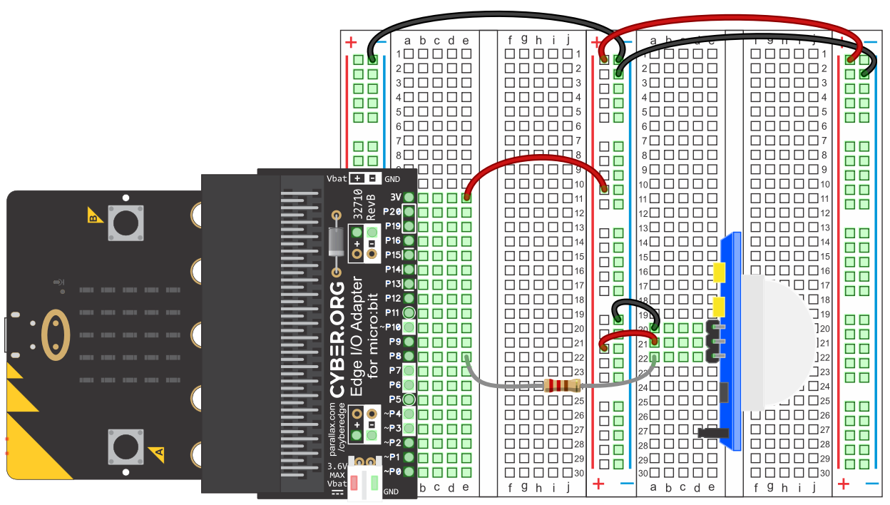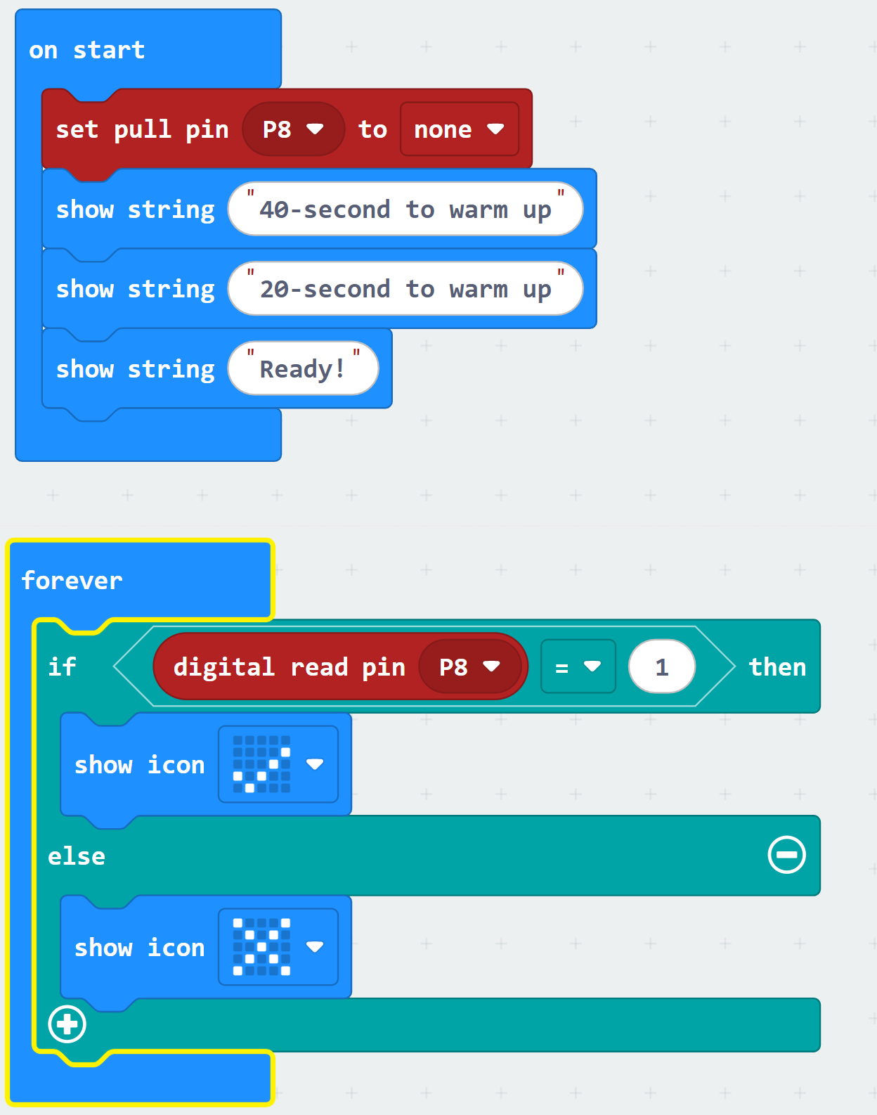Verify that the micro:bit’s 5×5 LED matrix display shows the checkmark ✔ for around five seconds after motion is detected. With no motion, it should display an X.