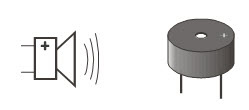 To emit sound, the cyber:bot uses a device called a piezoelectric speaker (piezospeaker). This speaker can make different tones depending on the rate of high/low electrical signals it receives. The schematic symbol and part drawing are shown below.
