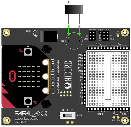 The picture above shows the schematic for the piezospeaker connected to P22. Notice that the cyber:bot board has two slots that fit the piezospeaker, and will connect it to P22.