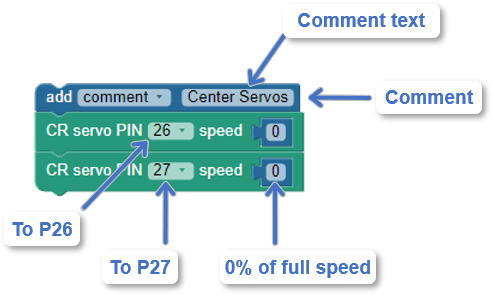 The CR servo PIN 26 speed 0 block tells the Propeller to send servo control signals to its P26 servo port. Those signals tell the continuous rotation servo connected to that port to hold a speed of zero. The last block is CR servo PIN 27 speed 0, which tells the Propeller to send those same zero speed signals to the servo connected to the P27 servo port.