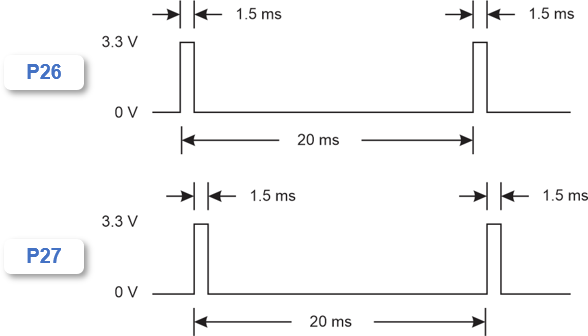 The signal that controls a servo’s speed and direction is a brief high signal that has to be repeated every 20 ms. That’s 50 times per second. The stay-still signal stays high for 1.5 ms and low for the remaining 18.5 ms. If you connected a light emitting diode (LED) circuit’s input to the P26 pin and the other end to ground, the light would glow during those brief 1.5 ms high signals and stay off the rest of the time.