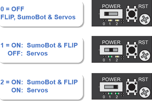 The POWER switch is designed so that 0 shuts everything off. This includes the Propeller FLiP. Even if it’s connected to USB, it will not accept a program until you set POWER to 1 or 2. The POWER 1 setting turns everything on except the servos. The POWER 2 setting turns everything on, including the servos.
