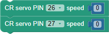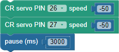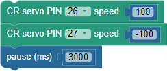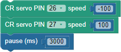 These blocks make the SumoBot roll forward at full speed, by making the left (P26) servo turn counterclockwise with a speed of 100 and the right P27 servo turn clockwise with a speed of -100. This maneuver continues for 3 seconds. It could potentially go longer than that if the next blocks are not CR servo PIN…speed… blocks.