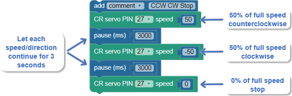 Next, CR servo PIN 27 speed -50 makes the servo turn at half speed clockwise, and the pause (ms) 3000 block below it allows it to continue turning for another 3 seconds.