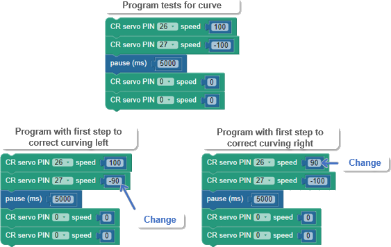If your SumoBot curved when you expected it to go straight, the solution is simple: slow down the faster wheel. Here are three short example programs. The top-center one is the test to see if your SumoBot curves. If it curves to the left, the first step is to change the CR servo PIN 27 block’s speed value from 100 to 90. If it curves to the right, the first step is to change the CR servo PIN 26 block’s speed value from 100 to 90.